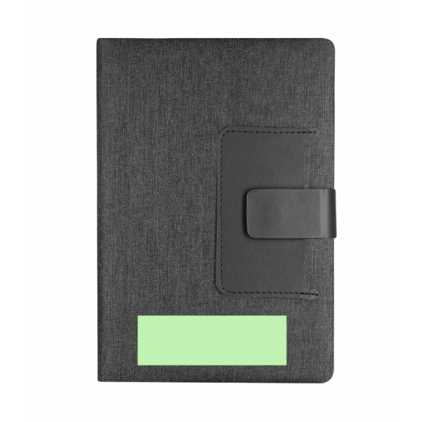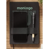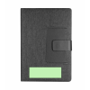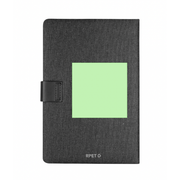 Bloc-notes à couvertures rigides en combinaison de polyester RPET 300D et PU. Inclut une poche en PU sur la couverture, idéale pour les cartes. Avec fermeture magnétique, 80 pages à lignes et marque-page assorti.