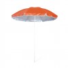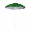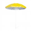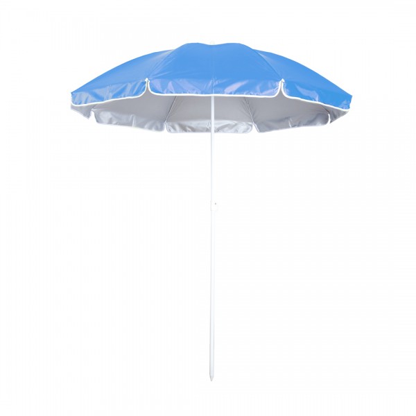 Parasol de plage 8 panneaux en nylon résistant, intérieur gris argent avec protection UV. Gamme variée de couleurs vives. Diametre 150cm avec jupes latérales gansées, tubes métalliques blancs réglables en hauteur.