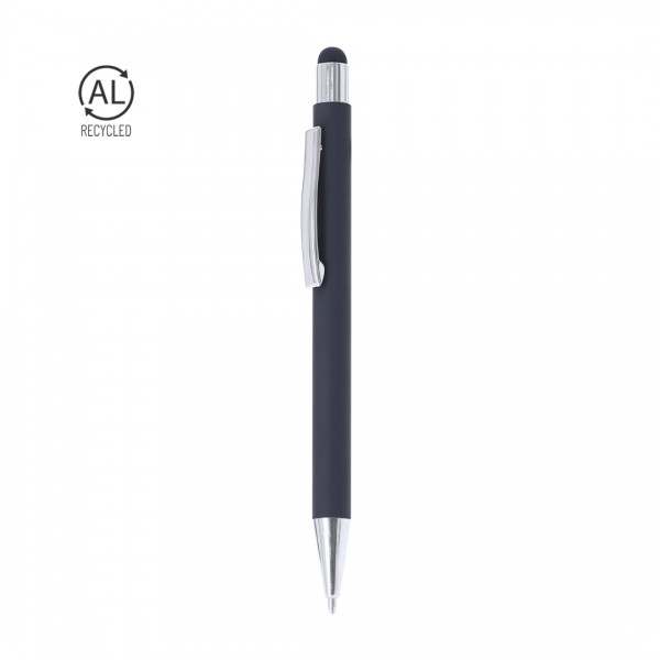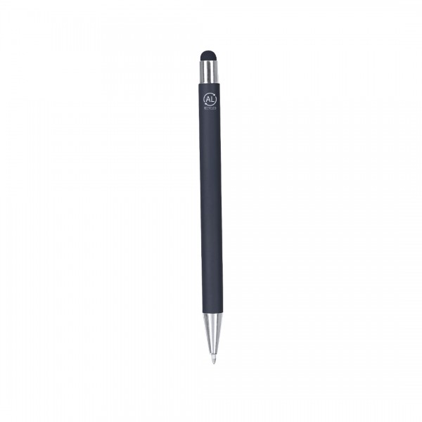 Stylo pointeur à mécanisme à pression fabriqué en aluminium recyclé. Bouton et clip métallique avec finition chromée, finition en pointeur assortie. Corps en finition caoutchouc, spécialement conçu pour marquage au laser. Marquage aluminium recyclé en haut du stylo. À cartouche jumbo et en encre bleue.